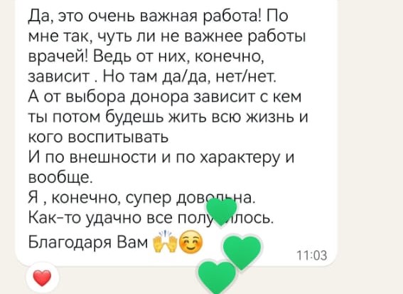 Онлайн-консультация — это не просто выбор донора по анкетам. Мы объединяем Ваши пожелания и опыт Карины, чтобы после одной встречи Вы знали, какой донор подходит именно Вам.