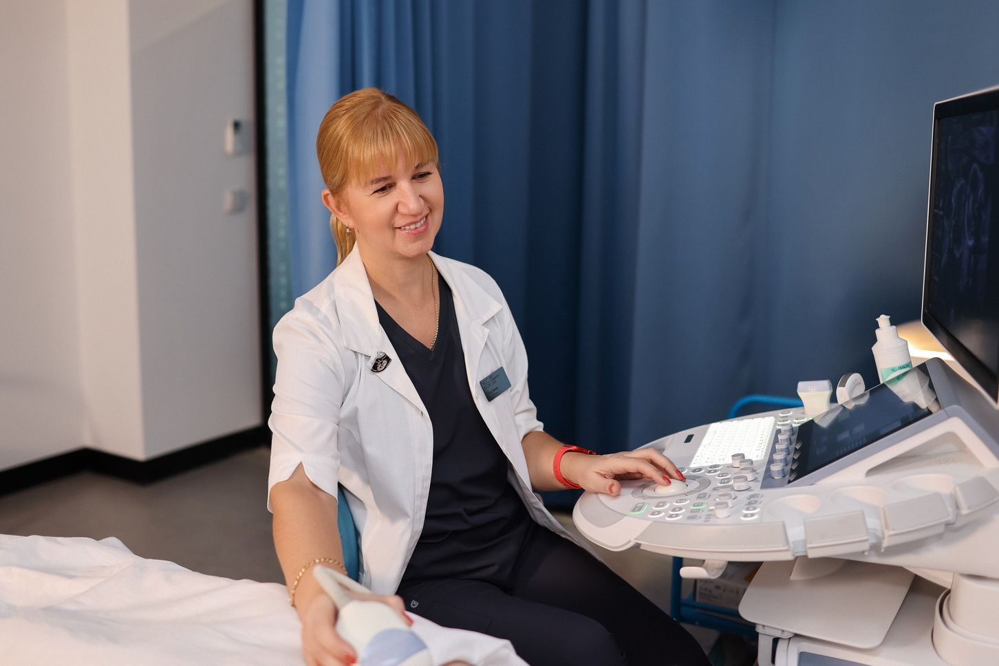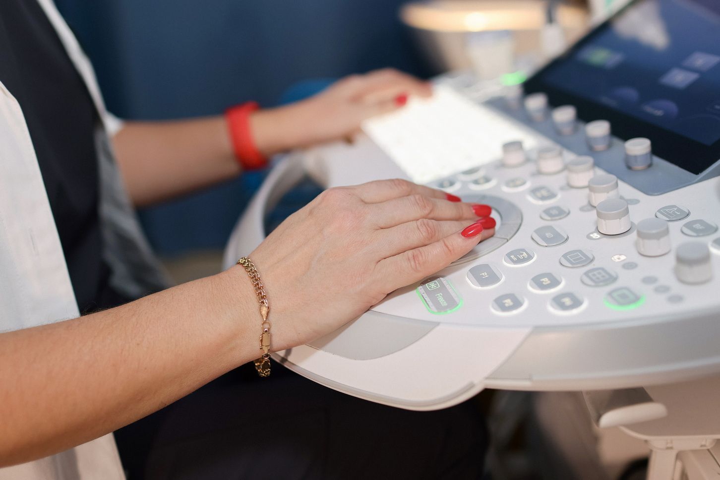 - С помощью датчика, которым врач водит по коже, проводится осмотр и выясняется состояние внутренних органов, находящихся в брюшной полости.
