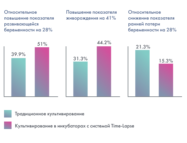 Эмбрион постоянно находится в инкубаторе. Для оценки морфологических качеств больше нет необходимости в извлечении биоматериала. Соответственно, на протяжении всего культивирование сохраняется одна и та же температура, влажность воздуха и не меняется содержание газов, что увеличивает эффективность протоколов ВРТ